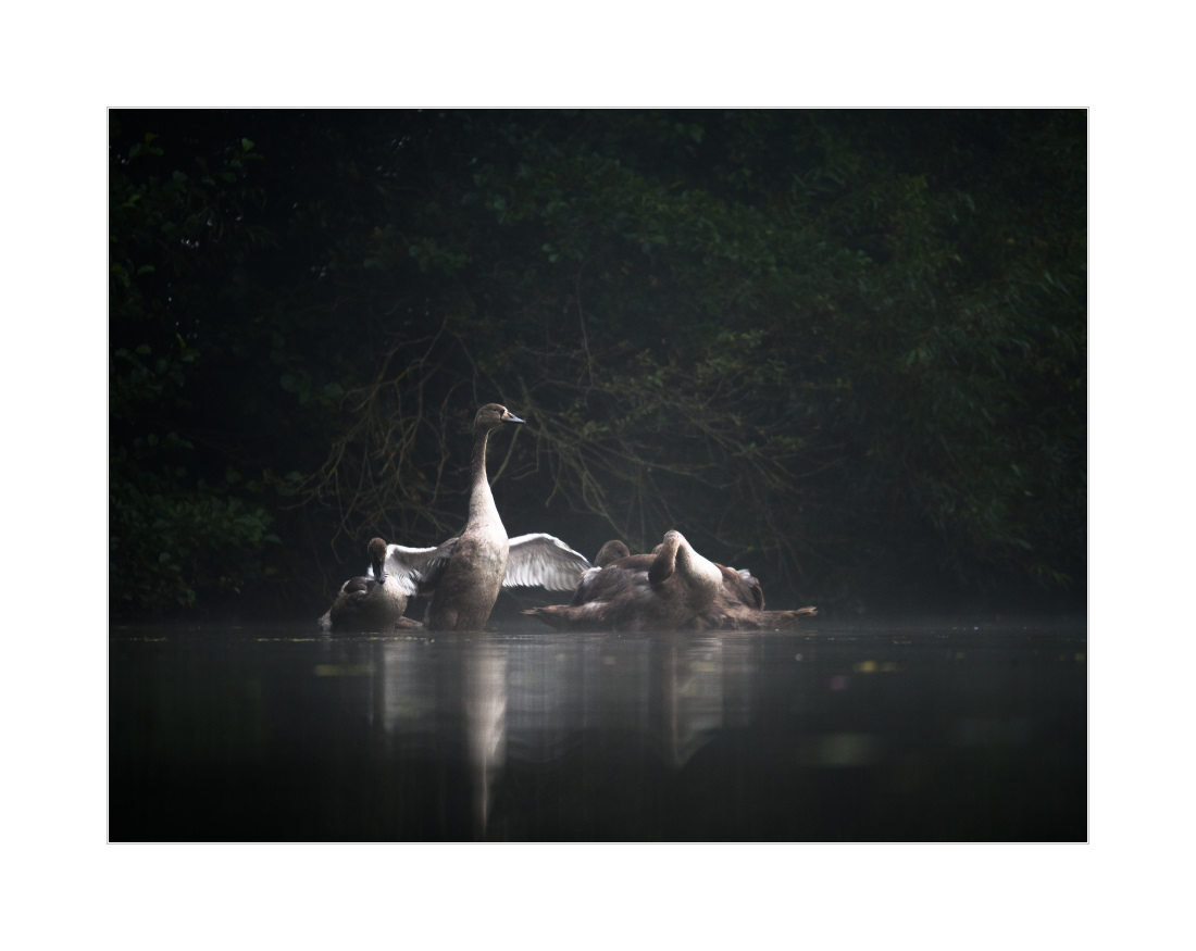 Na von wegen sie fliegen nicht weg, die Schwäne. Wobei es stimmt schon, weggeflogen sind sie nicht, aber sie haben mal wieder den See gewechselt. Fliegen geht mit den Jungtieren ja sowieso noch nicht (auch wenn sie schon fast richtige Flügel haben). Also heute Morgen ein akuter Mangel an Schwänen an den üblichen Stellen. War aber nicht weiter schlimm, der Nebel war – durch den frühmorgendlichen Schauer noch schön mit Futter versorgt – sowieso viel zu dicht da unten im Tal. Weiter oben im Wald sah das anders aus, hier zwei Fotos: