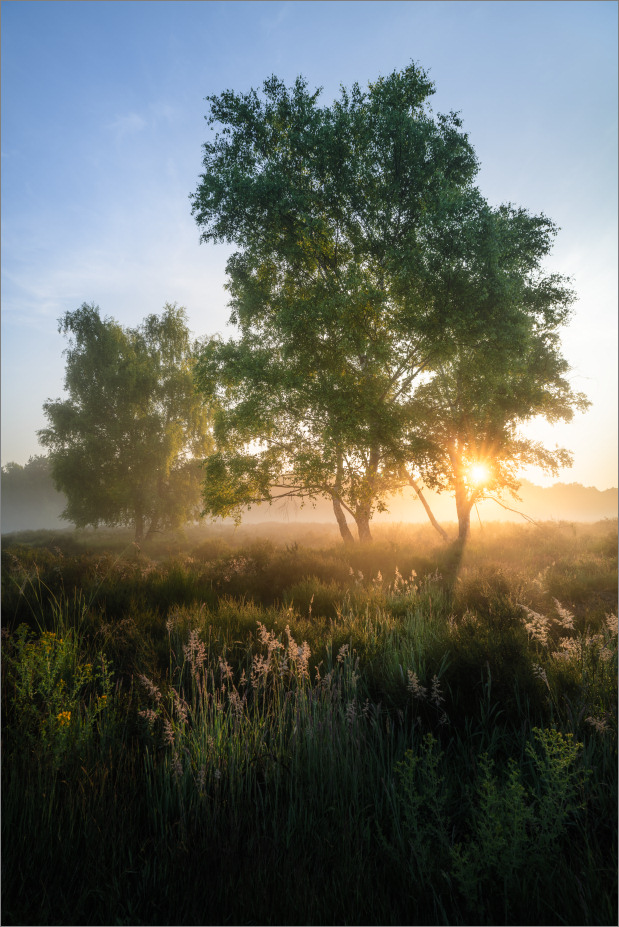 Und wenn’s schon mal so kühl und windstill ist und dabei der Himmel noch ziemlich klar ist, dann gibt’s natürlich auch etwas Nebel. Nicht viel, aber genug für ein Frühsommerfoto mit Birken und Sonne.