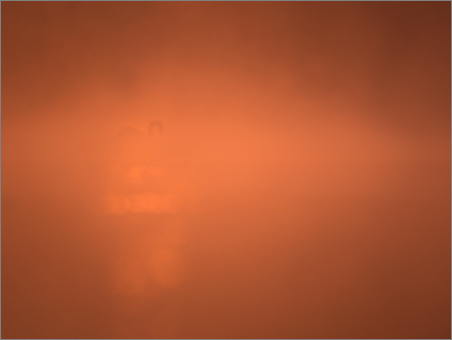 Wobei, eigentlich muss man nicht lange suchen. Ist ja doch recht eindeutig zu erkennen der Schwan da im dichten Nebel im Gegenlicht der gerade aufgehenden Sonne. Das war ganz schön knallrot heute Morgen. Kein Wunder bei dem vielen Dunst in der Luft.