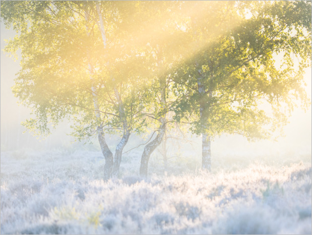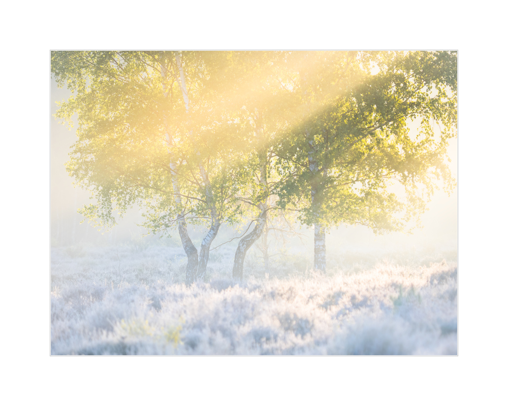 Na das war eine nette Überraschung heute Morgen. Nicht nur war’s (ein bisschen) kälter als gedacht, es gab direkt auch noch den ersten richtigen Nebel in meinem aktuellen Lieblingsgebiet in der Wahner Heide. Ehrlich gesagt: Ich war etwas überfordert am Anfang. So viele Möglichkeiten… Zu viele Möglichkeiten. Entschieden habe ich mich dann für ein paar Birken (eh klar) im Licht der aufgehenden Sonne. Und ein realistisch helles Detail habe ich dann auch noch direkt mitgenommen: