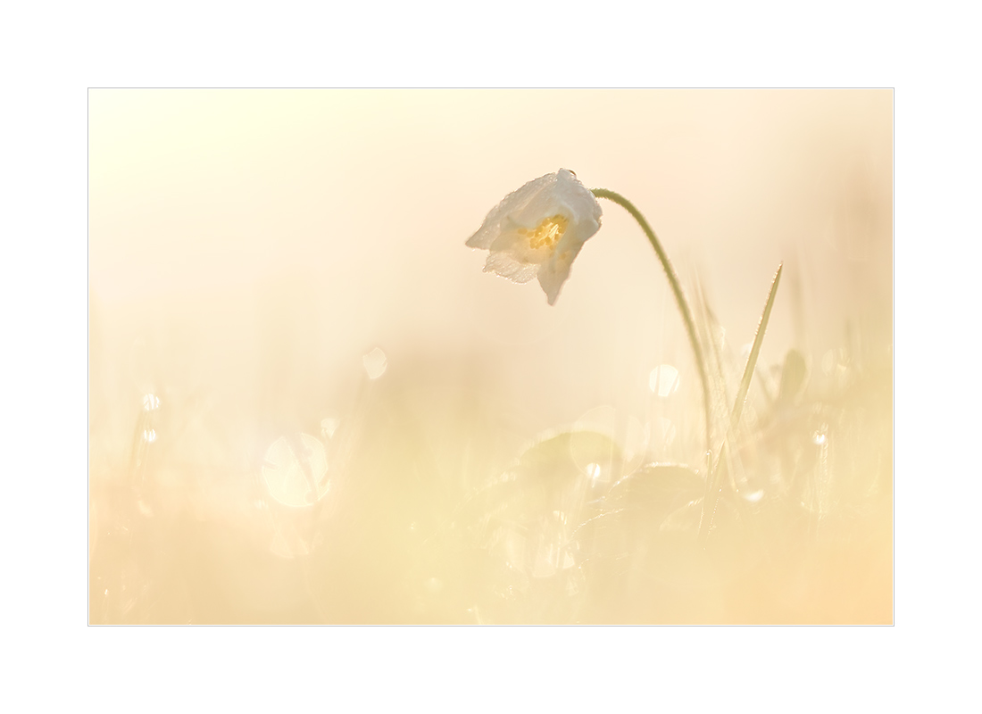 Ok, genug von Schwarzweiß und Spätherbstfarben… Heute gibt’s mal etwas helles aus einer in Tau gehüllten Morgenwiese: Ein blühendes Buschwindröschen im hellen Licht des Morgens.