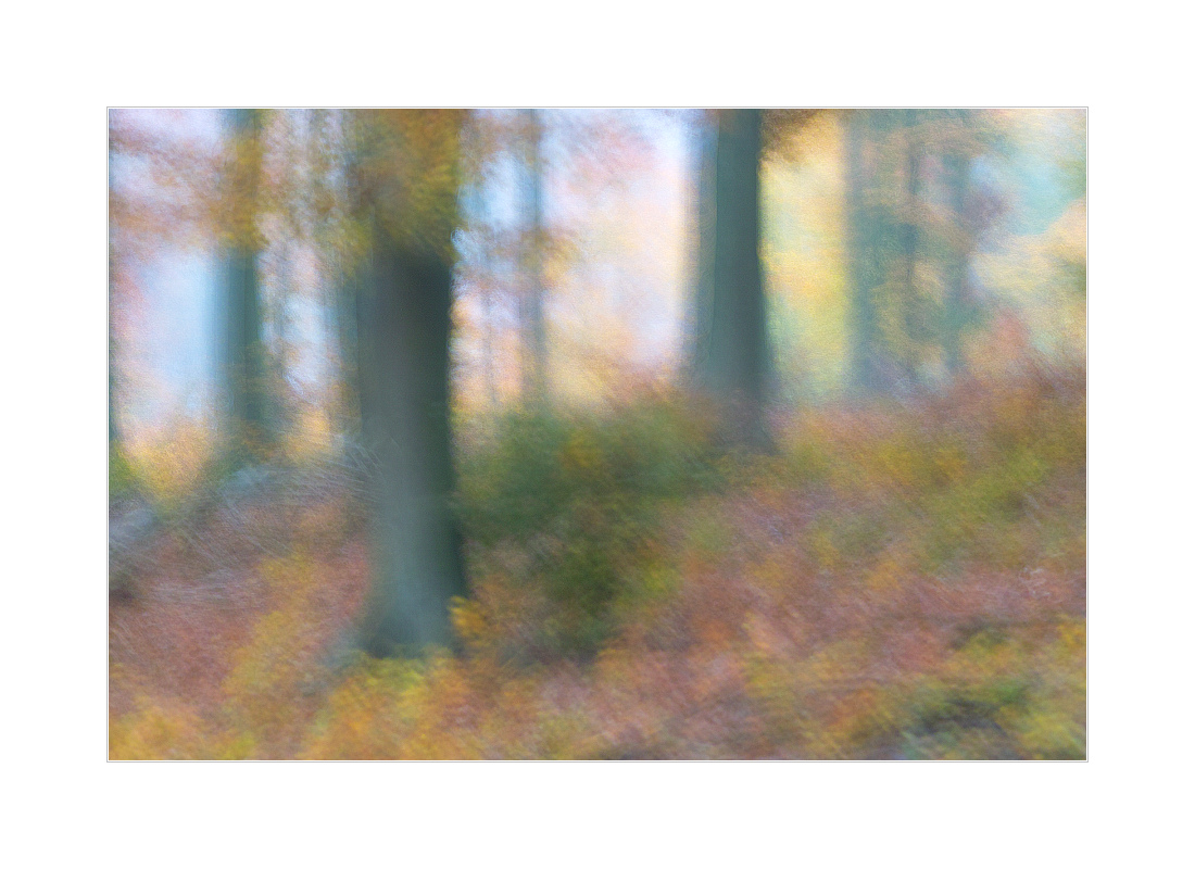 Noch ein Nachtrag: Wenn schon mal wieder nicht so richtig scharf, dann jetzt auch noch zwei ganz “unscharfe” Fotos… Das da oben ist übrigens mit einer Pseudodoppelbelichtung entstanden: 30 Sekunden belichtet und nach der Hälfte der Zeit kurz die Hand davor gehalten, den Fokus auf ganz nah gestellt und dann die Hand wieder weggenommen. Die beiden folgenden Fotos sind ein Wischer (Baumstämme mit verfärbtem Farn als Farbgeber) und ein Wackler. Ach, was tut man nicht alles wenn man keine Motive findet die in kompletter Schärfe was hergeben… ;)