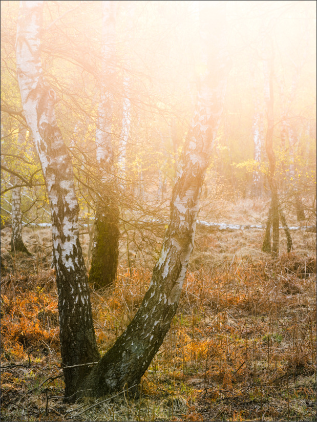 So ganz langsam kommt in den Birkenwäldern das erste Grün am Boden zum Vorschein. Viel ist es noch nicht (*). Und weil im Gegenlicht der aufgehenden Sonne das frische Laub an den Birken eher gelblich wirkt, sieht das einzige Foto, dass ich heute gemacht habe – dank fehlender Vegetation am Boden – halt eher bräunlich aus… ;)
