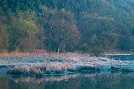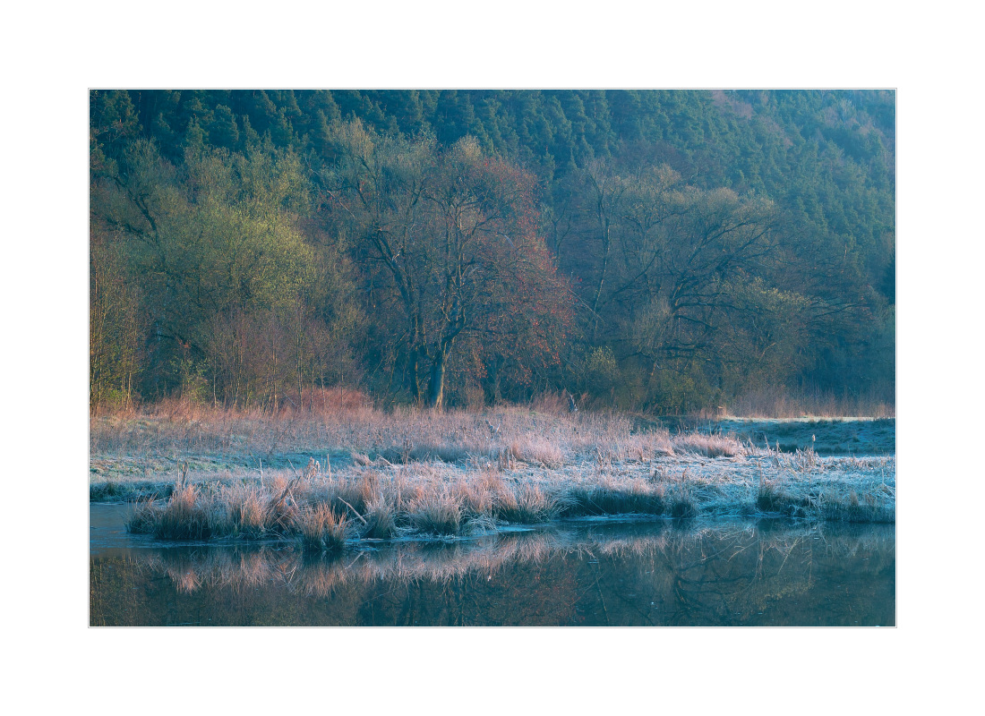 Jeden Tag wird es ein bisschen grüner da draußen in der Natur. Inzwischen zeigen auch die ersten Bäume mehr als nur einen ersten Hauch Grün. Nicht mehr lange und die Landschaftsfotografie macht auch hier im eigentlich unspektakulären Flach- bis Hügelland wieder richtig Freude! Heute Morgen war’s allerdings nochmal richtig frostig mit knapp unter -4°C. “Mein” Altarm bei mir im Tal unten hatte an den Ufern direkt wieder eine dünne Eisschicht…