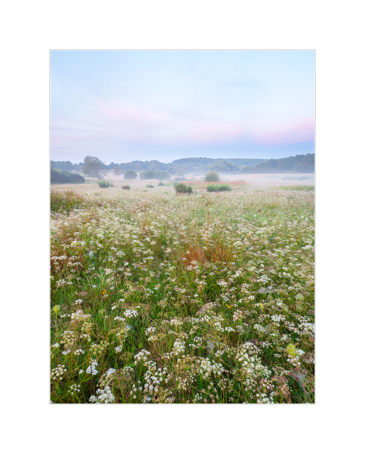 Eigentlich wollte ich ja wieder zu den Schwänen heute Morgen, aber nachdem mein Fahrrad gestern einen akuten Schwächeanfall hatte und ich aufs Auto ausweichen musste, habe ich mich dieses Mal nach längerer Zeit wieder für das NSG Kleine Lummersbach bei Cyriaxweimar (ich schreib das nur deshalb immer ganz hin, weil es sich so exotisch anhört) entschieden. Mit Auto und Fuß sind die Seen einfach zu groß, da verpasst man doch glatt das gute Licht wenn man von A über B nach C gehen muss… Aber gut, die Schwäne laufen fliegen ja nicht weg, heute also etwas total unschwanig-seenloses: Eine Wiese bei Sonnenaufgang mit etwas Nebel. Etwas mehr Abwechslung bei den blühenden Pflanzen wäre an sich ganz nett gewesen… ;)