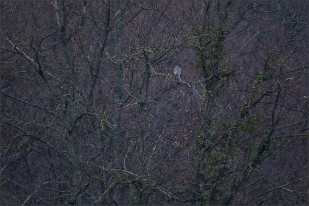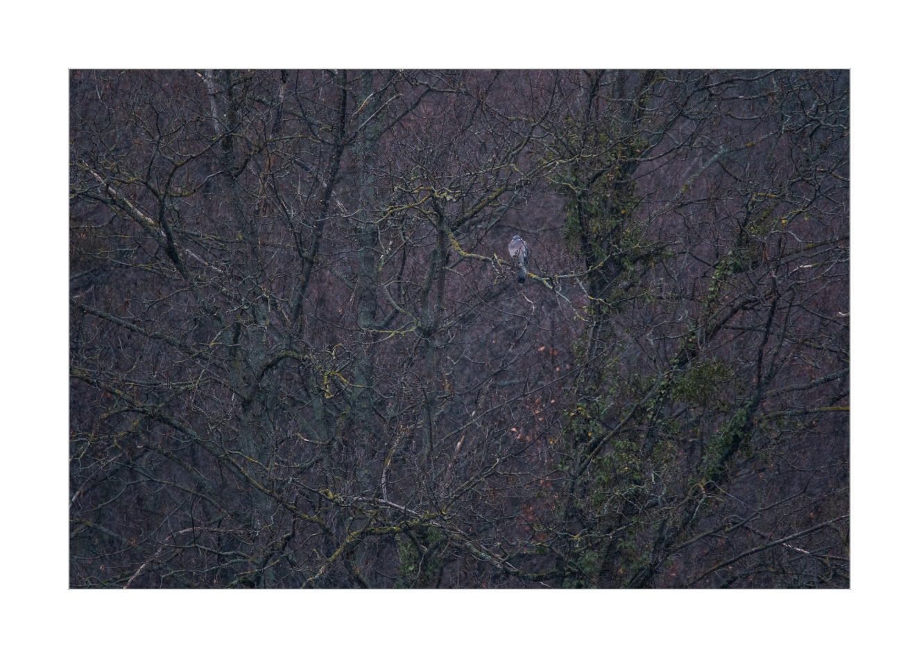 Ein kurzer Teleblick vom Balkon im Schneefall in Richtung Waldrand hat ja oft was. Besonders wenn es richtig schneit und man dann noch sowas ähnliches wie ein Motiv findet. Hätte fast gut funktioniert gerade. Nur richtig geschneit hat es (noch) nicht. Waren zwar schon viele Schneeflocken, allerdings waren sie viel zu klein. Dafür wäre das Motiv mit der im Baum sitzenden Taube an sich ganz gut gewesen. Mal sehen ob, falls es nachher(*) noch richtig schneit, auch irgendwo noch ein großer Vogel im Baum sitzt. Ein Schwan vielleicht? ;)