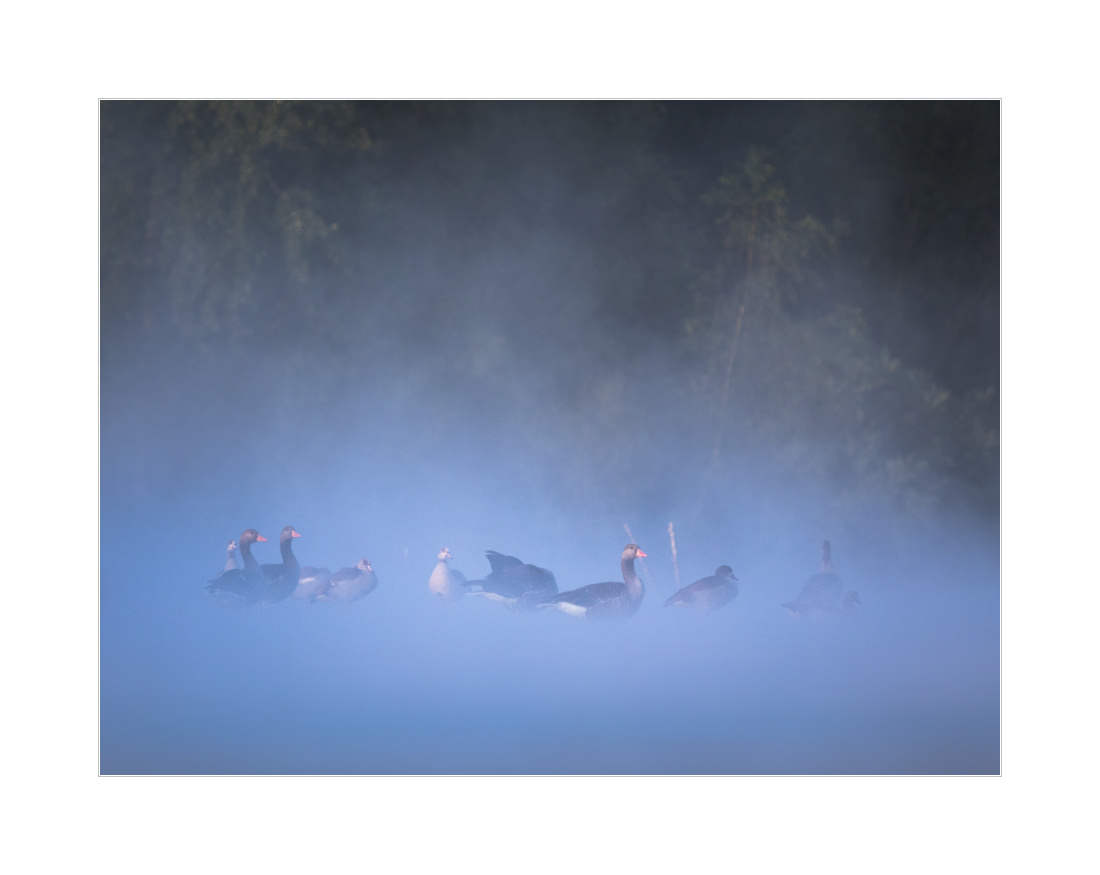 So kalt war’s schon lange nicht mehr. Gerade mal noch 4°C hatte es heute Morgen im Tal bei den Seen. Schön frisch, schön neblig. Schön viele hohe Wolken auch, also schön wenig richtiger Sonnenschein. Narf. Ich hab dann einfach das gemacht, was ich immer mache wenn ich am See bin, das Wasser dampft und keine Schwäne anwesend sind: Nebel fotografiert und Gänse (dieses Mal Grau- und Nilgänse in friedlicher Koexistenz) fotografiert… Hier zwei Impressionen: