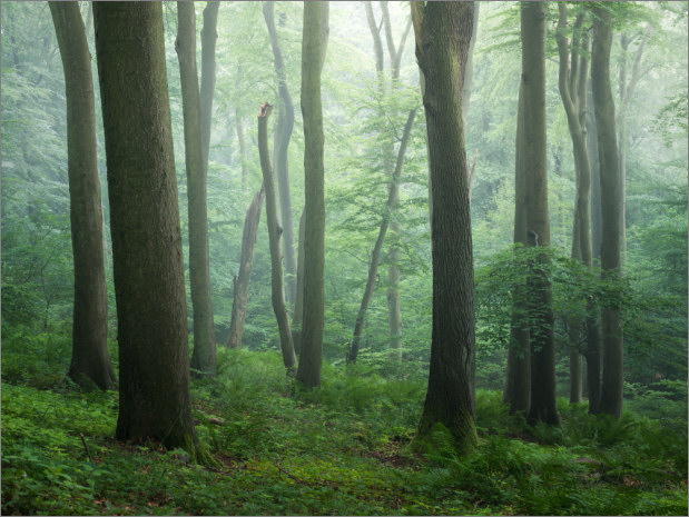 Hier ein Foto des Morgens. Ich mag die vielen unterschiedlich kühlen Grüntöne. Nebel und Wald, einfach gut: