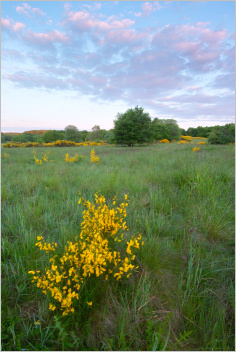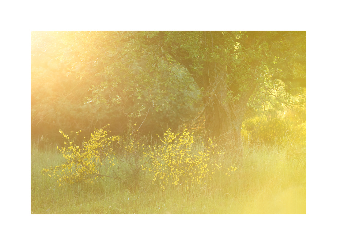 Heute endlich mal wieder keine Wolkenwurst in Richtung Sonnenaufgang. Komischerweise gab’s allerdings trotz ziemlicher Windstille und nur wenigen störenden Wolken am Himmel nicht einmal einen Hauch von Nebel. Sogar Tau war kaum vorhanden in den Wiesen. Welch grausame Laune des Schicksals… Hier drei Impressionen von heute Morgen mit blühendem Ginster:
