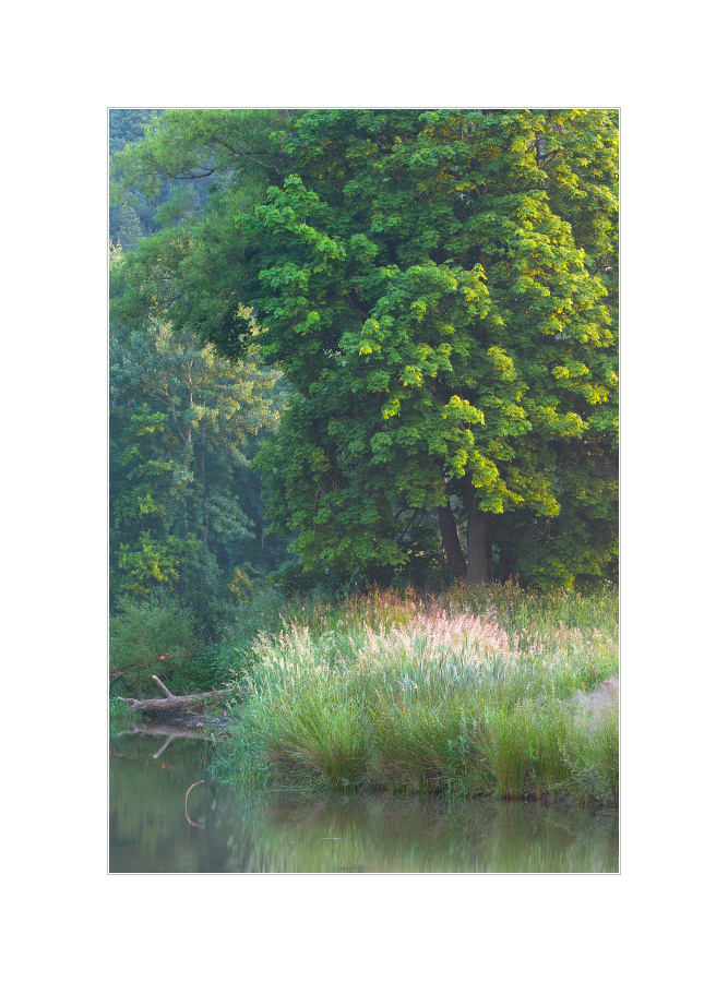 Das war dann auch dem Nebel schnell zu warm heute Morgen. Vor Sonnenaufgang konnte er sich zwar noch etwas halten (wobei er es schwer hatte, die Wiesen sind gemäht, da wird ihm doch viel Nahrungsgrundlage entzogen), aber als das Licht dann spannend wurde, war nicht mehr viel von ihm zu sehen. Verübeln kann man ihm das nicht bei dem Wetter… Hier ein Foto meiner Lieblingsstelle im Tal. Wirkt langsam schon sommerlich:
