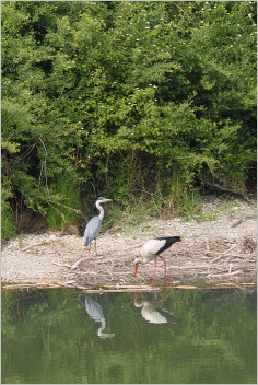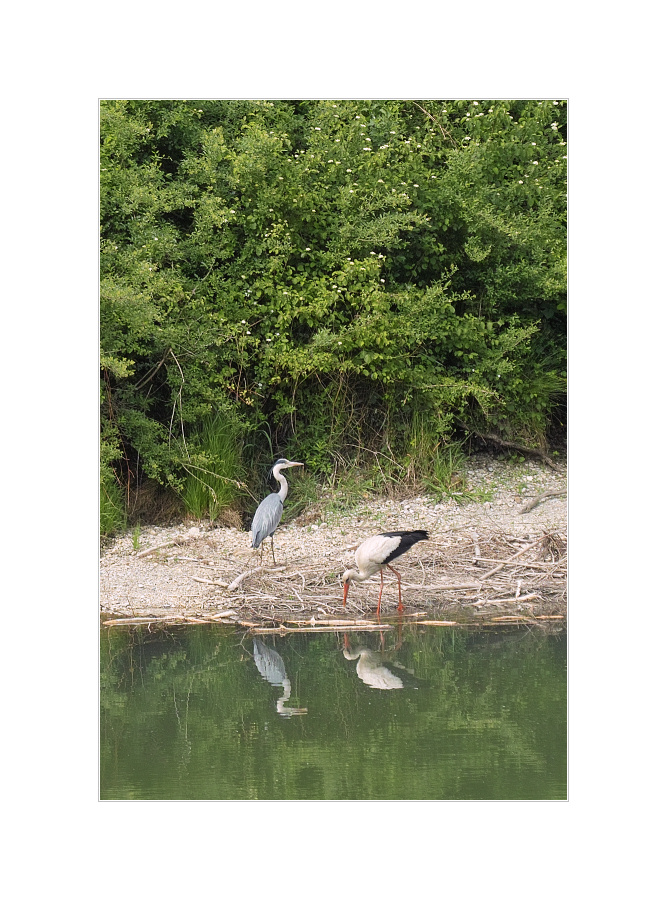 Und zum Schluss noch der Weißstorch, interessanterweise im Duo mit einem Graureiher. Es hat zwischendurch fast so gewirkt als hätte der Storch Freude daran gehabt den Reiher immer wieder zu vertreiben.