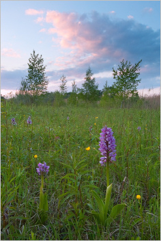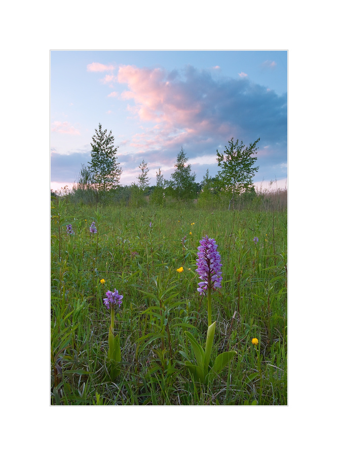 Gestern gab es für mich gleich zwei Premieren in der Lobau: Zum ersten Mal habe ich dort einen wild lebenden Bären gesehen und ebenfalls zum ersten Mal einen Weißstorch. Letztere sind zwar im Osten Österreichs sowieso nicht wirklich selten, in die Lobau hat sich während meiner Anwesenheit allerdings trotzdem keiner verirrt. Zuerst aber das obligatorische Sonnenuntergangsfoto, heute mit Helmknabenkraut: