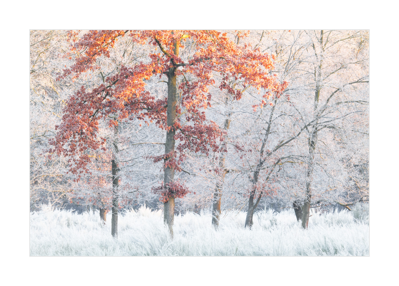 Nachdem es über Nacht so richtig schön kalt war, hat’s nicht mal Nebel gebraucht um die Landschaft so richtig schön einzueisen. Der Nebel kam dann aber trotzdem, pünktlich zum Sonnenaufgang. Aber nicht in der nervigen Form, der die Sonne einfach komplett verdeckt, sondern in der Form, der durchaus angenehme Effekte auf Fotos hat. Mal war die Sonne im Nebel, mal war der Nebel knapp drunter und insgesamt war’s eine Stimmung, die man so eher nicht all zu oft erlebt.