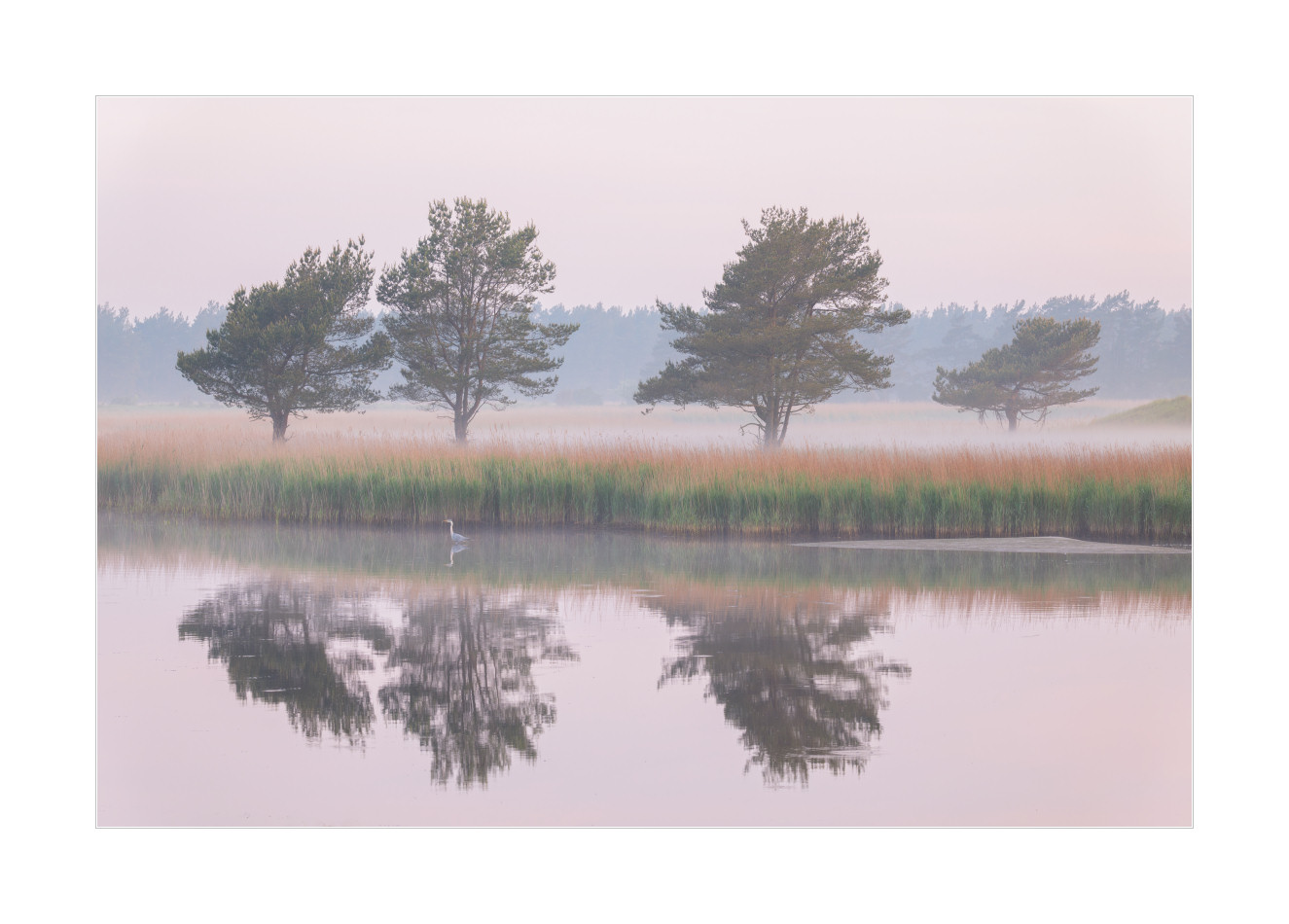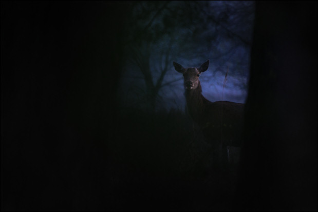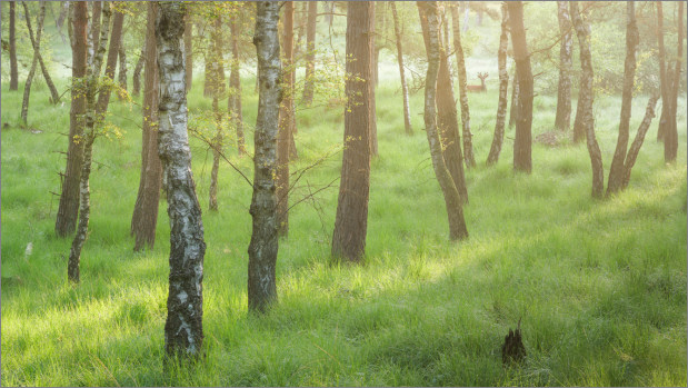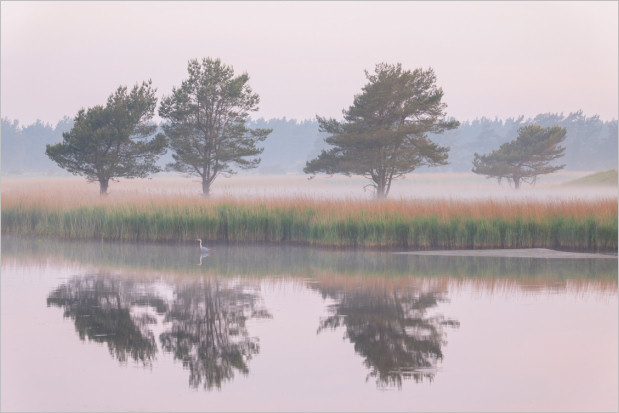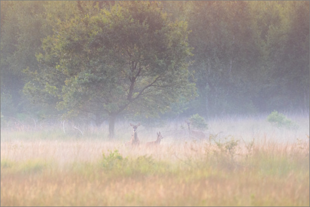 Etwas früher am selben Morgen und als ich genau dasselbe gemacht habe, nämlich schauen was sich so tut abseits der Hirsche, hat mir auch diese Szene hier sehr gut gefallen. Nette Nebelschwaden über der Landschaft, cooles Licht, nette Bäume, ein Graureiher – der in die falsche Richtung spaziert – und überhaupt, genau meine Stimmung.