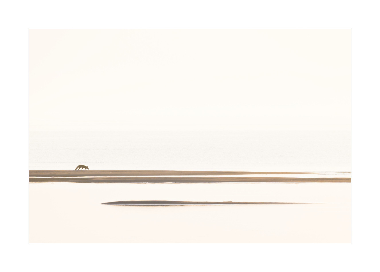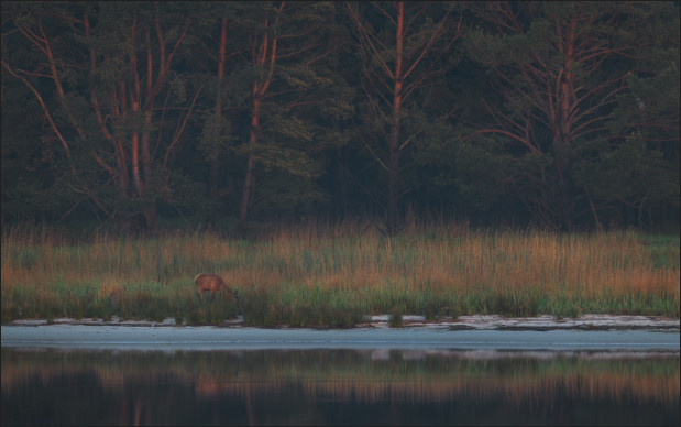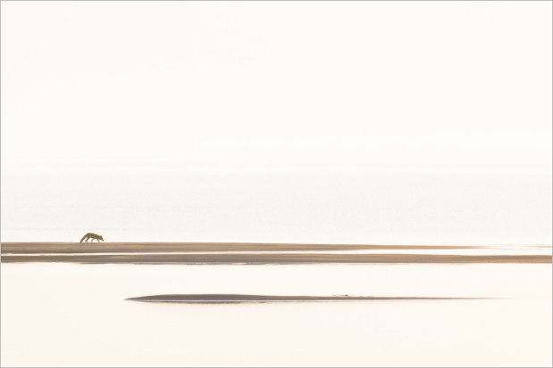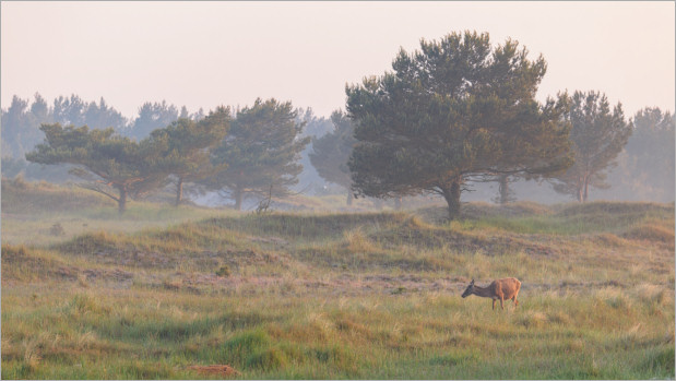 Während ich dann dort so den Hirschen beim Rumhirschen zugeschaut habe (auch dazu später mehr) und meinen Blick immer mal wieder über die Landschaft habe schweifen lassen, ist mir dieser nette Fuchs aufgefallen, der in der Ferne im Gegenlicht über eine Sandbank spaziert ist. Hat wohl nach essbarem gesucht. Irgendwelche angeschwemmten Dinge. Eine Szene genau nach meinem Geschmack.