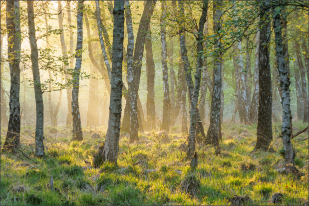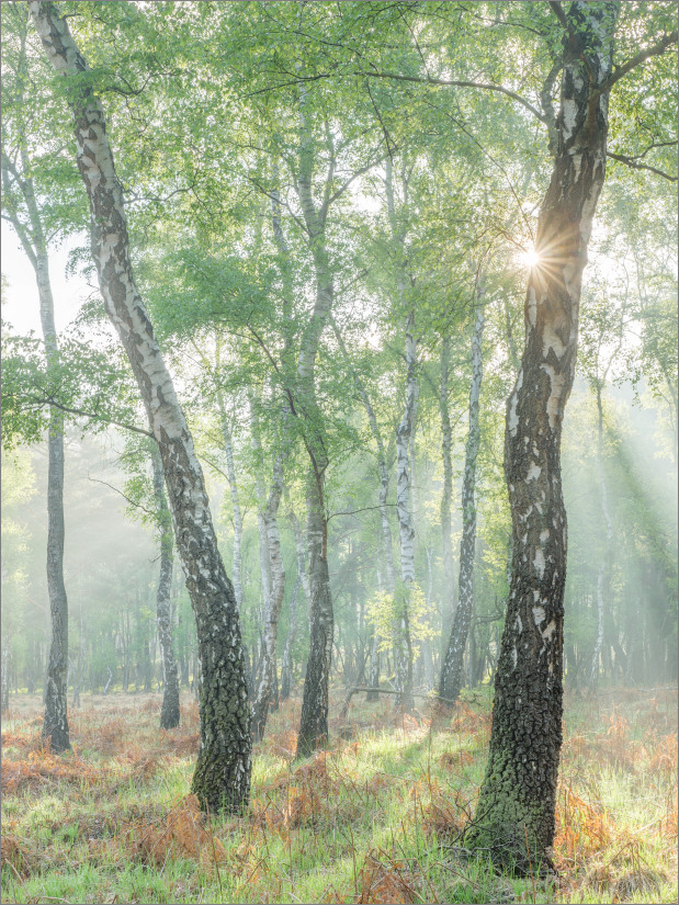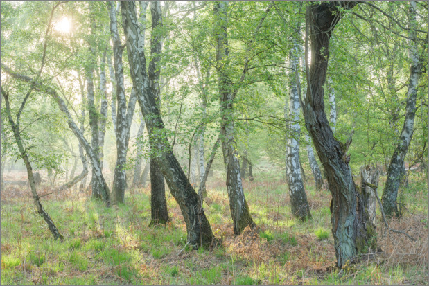 Aber! Neuerung! Endlich mal wieder Fotos nicht freistehender Birken, sondern solche, die per Definition ein Wald sind. Wobei, wenn ich mich richtig entsinne, gibt es viele Definitionen was ein Wald ist. Egal. Birkenwald war es eindeutig in dem Fall. Erst mit eher tief stehender Sonne und dadurch schön warmen Licht. Danach dann mit schon etwas höher stehender Sonne. Das war allerdings in Kombination mit der sehr feuchten Luft nicht weniger reizvoll:
