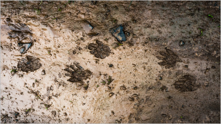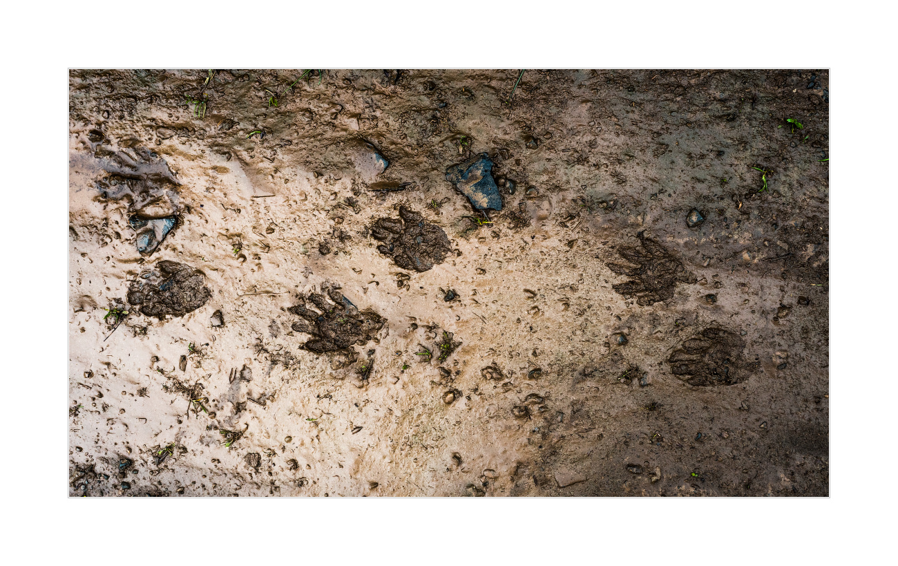 Und, wie fast jedes Mal wenn ich dort zur Morgendämmerung unterwegs bin, gab es auch dieses Mal nette Begegnungen mit Tieren. Ein Waschbär und ein Fuchs mit einem (vermutlich) Kaninchen im Maul. Fotografiert habe ich sie beide nicht, aber immerhin ein paar Spuren die ein Waschbär in einer langsam wieder trocknenden Pfütze hinterlassen hat: