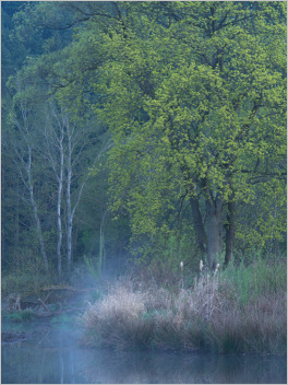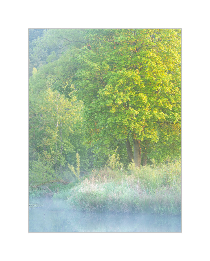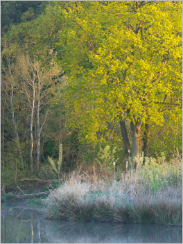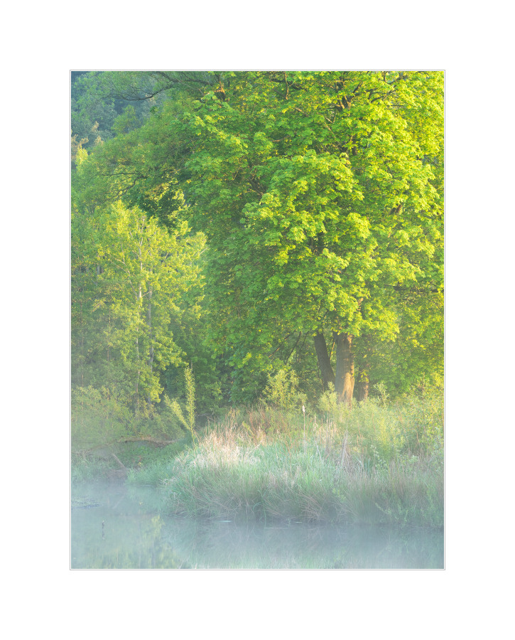 Doch… Wieder der Altarm… Der frostige Morgen (hatte -2°C im Tal unten) hat mir keine andere Wahl gelassen. Ich hoffte auf Reif in der auf dem Foto sichtbaren bodennahen Vegetation. Ein bisschen was war auch da, fällt auf dem Foto leider nicht so ganz auf. Hier die Szene mit voller Sonnenaufgangssonne bestrahlt und (fast) komplett ohne Nebel: