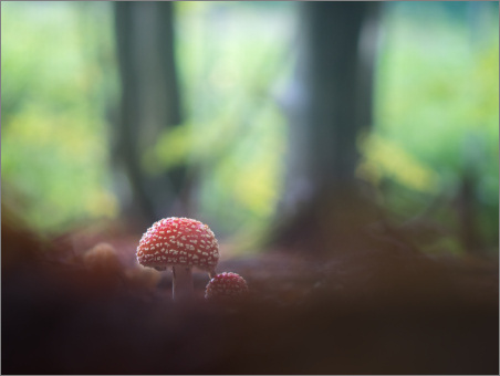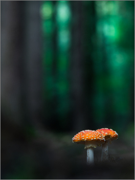 Ups, schon wieder Fliegenpilz. Aber dieses Mal sind es wenigstens zwei Fliegenpilze auf einem Foto. So gesehen also ein Unterschied von 100% zu den letzten Fotos. Außerdem ist es noch ein bisschen düsterer als das letzte Foto. Also ein echt ganz anderes Foto.