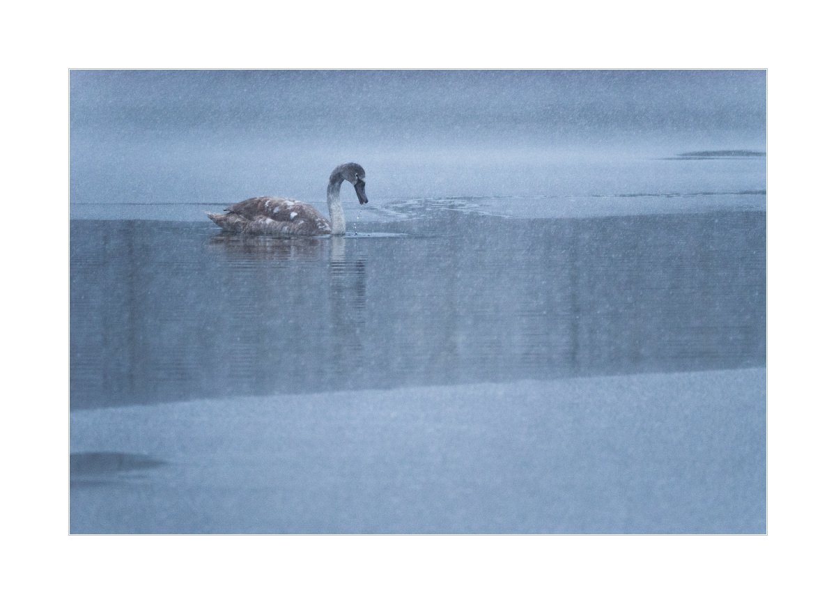 Wenn ich jetzt jammern wollen würde, würde ich ankreiden, dass es erst mittags angefangen hat und deshalb kein einziger erwachsener (=weißer) Schwan auf den Seen unterwegs war (und dort, wo sie waren, war’s einfach unfotogen). Zum Glück saß ein Silberreiher am Ufer eines der Seen rum. Und die jungen Schwäne waren auch wieder unterwegs. Viel Freude hatten die mit dem Wetter allerdings offensichtlich nicht. Vor allem auch deshalb, weil die eis- und schneematschfreien Flächen immer kleiner wurden. Hier drei Impressionen von heute Mittag: