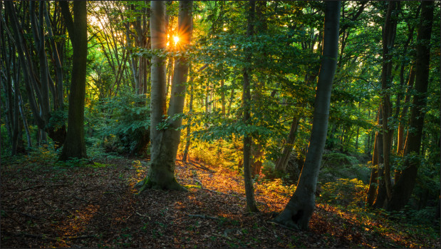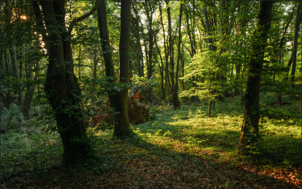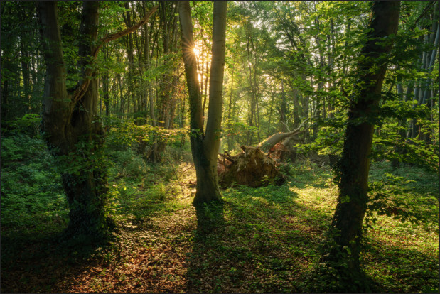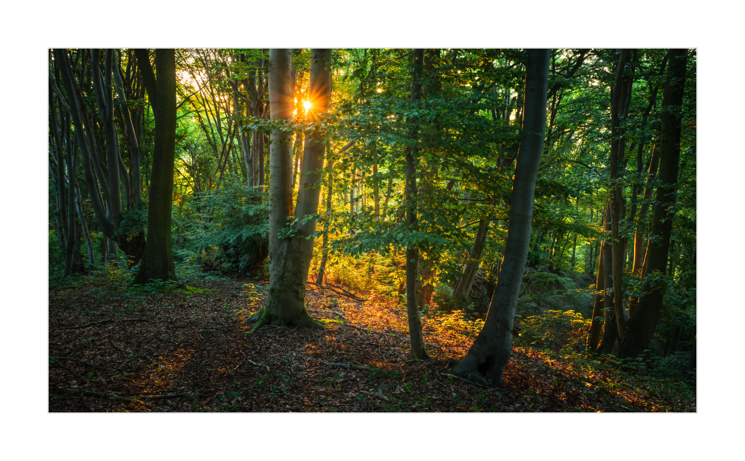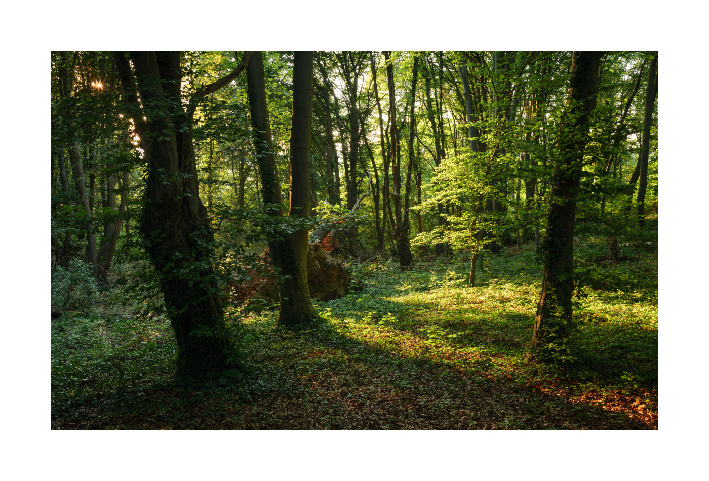 Ein Sonnenaufgang im Wald ohne Nebel ist ja – zumindest was Landschaftsfotografie (oder Waldfotografie) betrifft – nicht so ganz mein Favoritending. Sind ja doch sehr schnell sehr viele Kontraste. Die meisten Wälder sind auch nicht so freundlich die tiefstehende Sonne wirklich irgendwo sinnvoll in die Motive reinscheinen zu lassen. Ich habe da zum Glück ein Stück Wald in der Nähe, in dem das bei Sonnenaufgang immer ganz gut klappt und in dem an sich die Bäume auch recht fotogen sind.