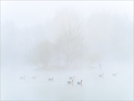 Dafür gibt es heute ein paar Graugänse. Die Wetterwiederholung gab es wirklich, es war nur noch ein bisschen kälter. Hat ganz knapp nicht für Luftfrost gereicht. Und weil es kälter war und die Seen dadurch noch ein bisschen mehr gedampft haben, war auch der Nebel noch ein kleines bisschen dichter als gestern.