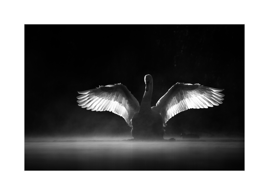 Schade, so richtig neblig war’s jetzt dann leider nicht heute Morgen. Da war die Luft wohl doch zu trocken. Immerhin ein Schwan hat sich heute Morgen zwischendurch erbarmt und während ich da so rum saß und ihm bei der morgendlichen Gefiederpflege zuschaute ein paar mal mit den Flügeln geflattert. Hier ein Foto:
