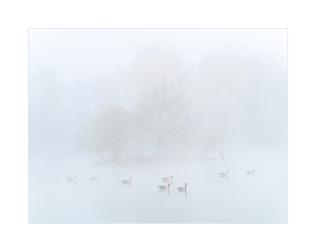 Dafür gibt es heute ein paar Graugänse. Die Wetterwiederholung gab es wirklich, es war nur noch ein bisschen kälter. Hat ganz knapp nicht für Luftfrost gereicht. Und weil es kälter war und die Seen dadurch noch ein bisschen mehr gedampft haben, war auch der Nebel noch ein kleines bisschen dichter als gestern.