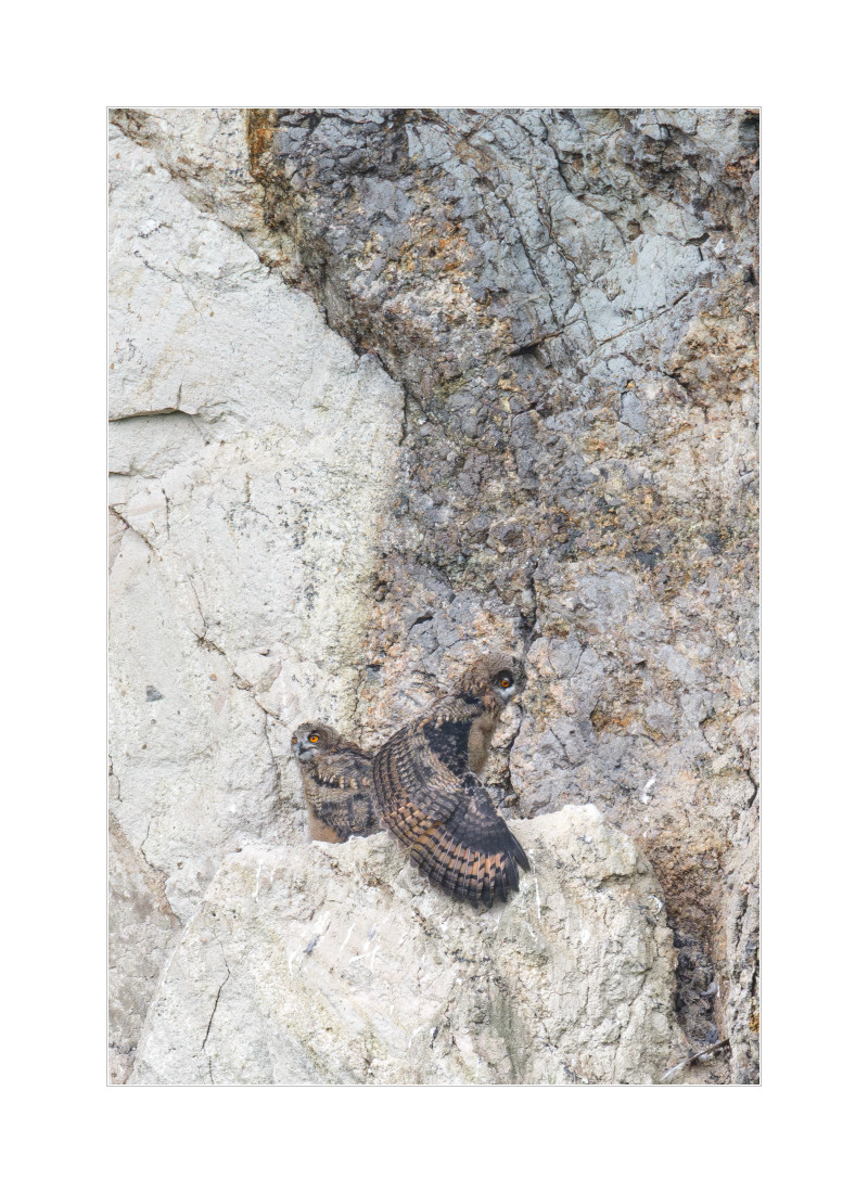 Als ich vor ca. zwei Wochen dort war, saßen beide jungen Uhus irgendwo weiter unten gut versteckt im Gestrüpp. Heute saßen die beiden interessanterweise wieder dort, wo sie zur Welt gekommen sind: Etwas weiter oben auf einem gut geschützten Felsvorsprung. Wie auch immer sie da wieder raufgekommen sind.