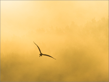 Heute war’s zwar mal wieder nicht neblig, aber der Dunst war dicht genug um zumindest einen Hauch von Nebelstimmung aufkommen zu lassen. Außerdem sorgte er dafür, dass die Sonne die “Suppe” schön eingefärbt hat. Hier ein Bild mit Haubentaucher und fliegender Nilgans: