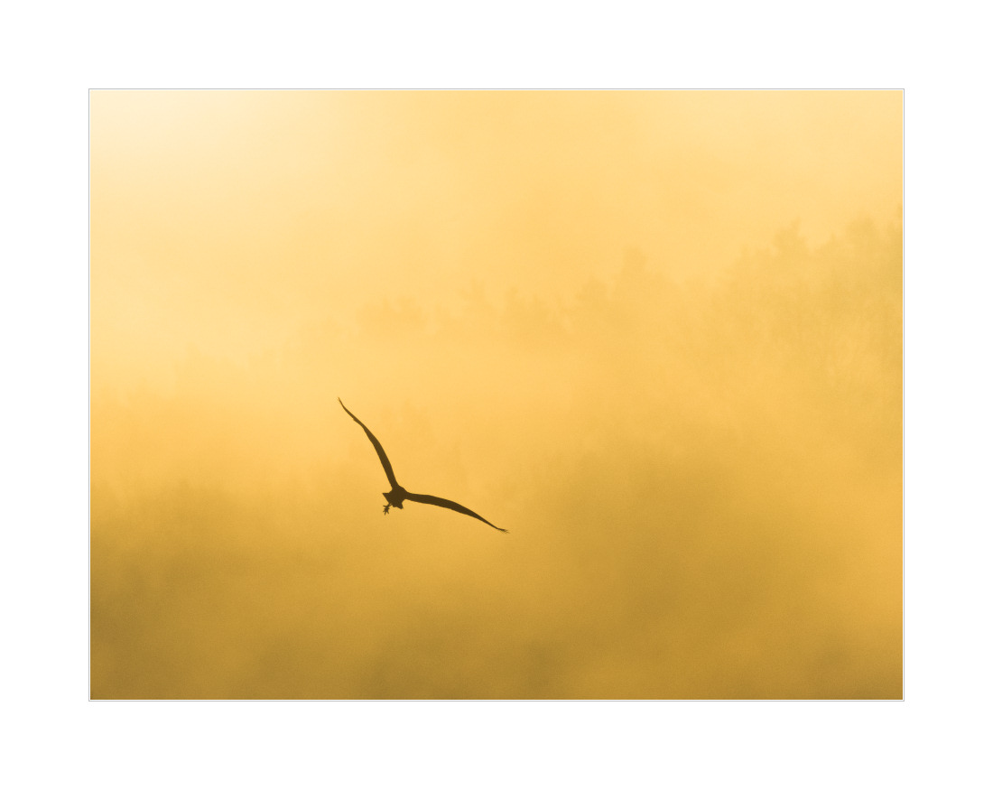 Gestern war super, heute war eher nicht so der Bringer. Zumindest nicht dort wo ich war. Ich wollte mein Glück an anderen Seen versuchen. Und während der Nebel die Wiesen teilweise schön bedeckte, waren die Seen so ziemlich nebellos. Die Wiesen boten leider auch nicht die Motive, die ich mir im Allgemeinen so wünsche. Wer will schon Strommasten? Also bin ich einfach ohne ein Foto zu machen zurückgefahren und habe noch einen Abstecher zur Ohmmündung gemacht. War an sich auch nicht sonderlich spannend, wäre da nicht auf der Spitze einer ziemlich toten Lärche dieser Fischadler gesessen: