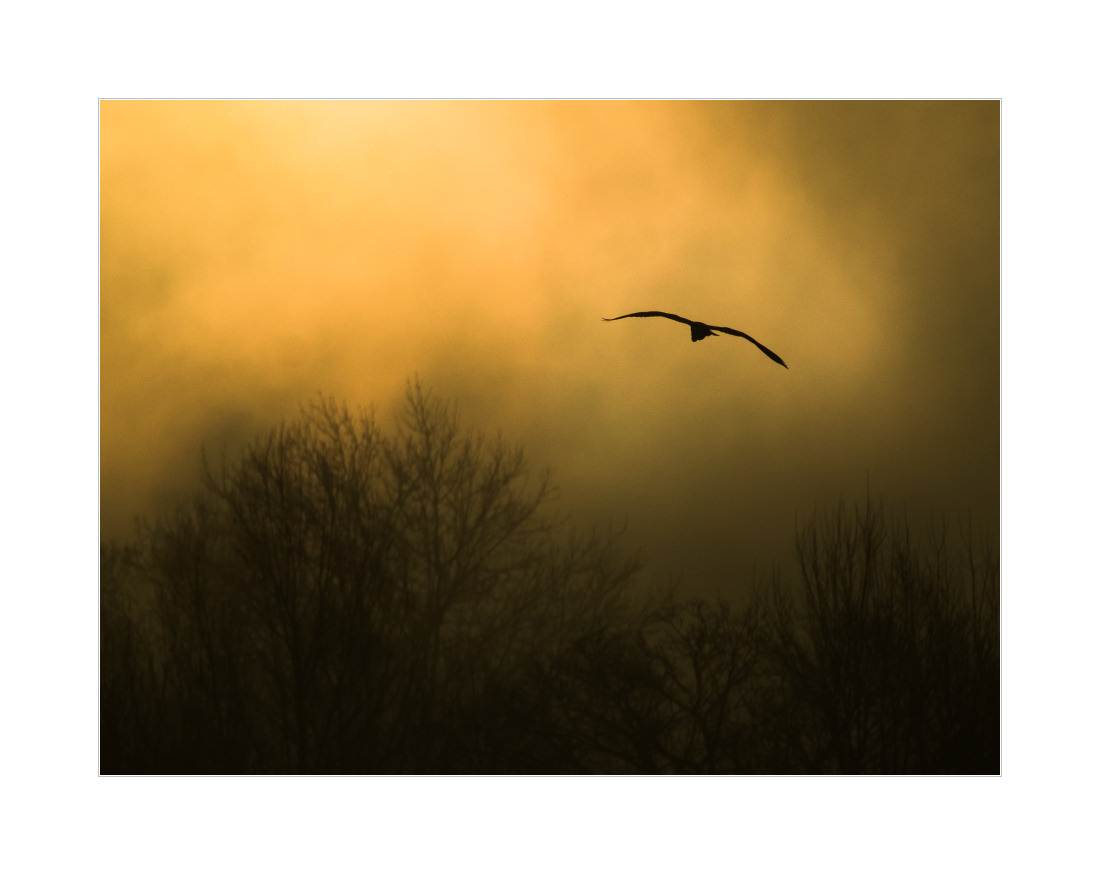 Heute war’s zwar mal wieder nicht neblig, aber der Dunst war dicht genug um zumindest einen Hauch von Nebelstimmung aufkommen zu lassen. Außerdem sorgte er dafür, dass die Sonne die “Suppe” schön eingefärbt hat. Hier ein Bild mit Haubentaucher und fliegender Nilgans:
