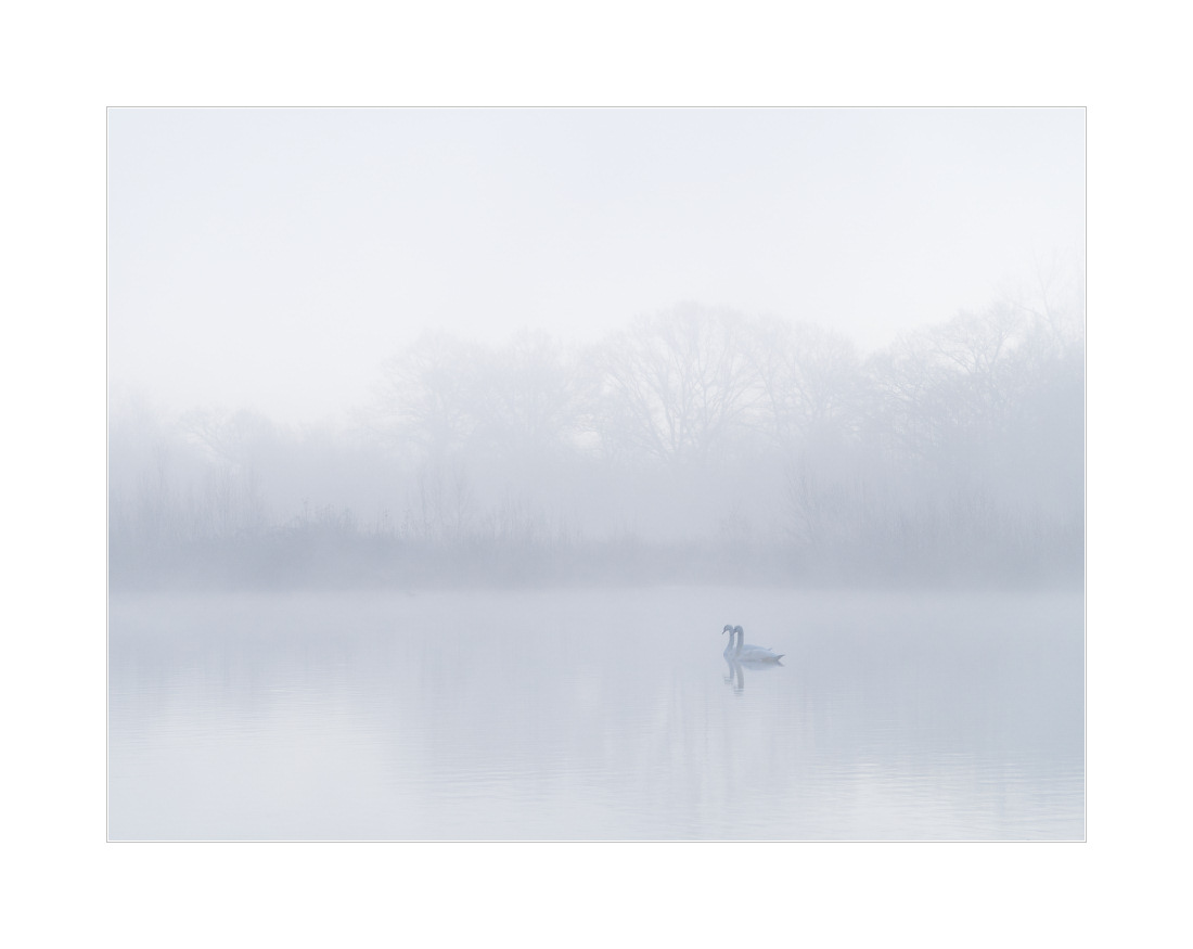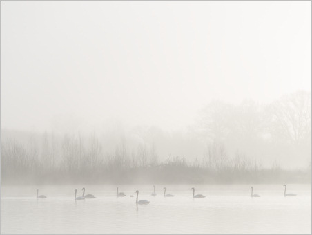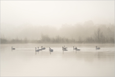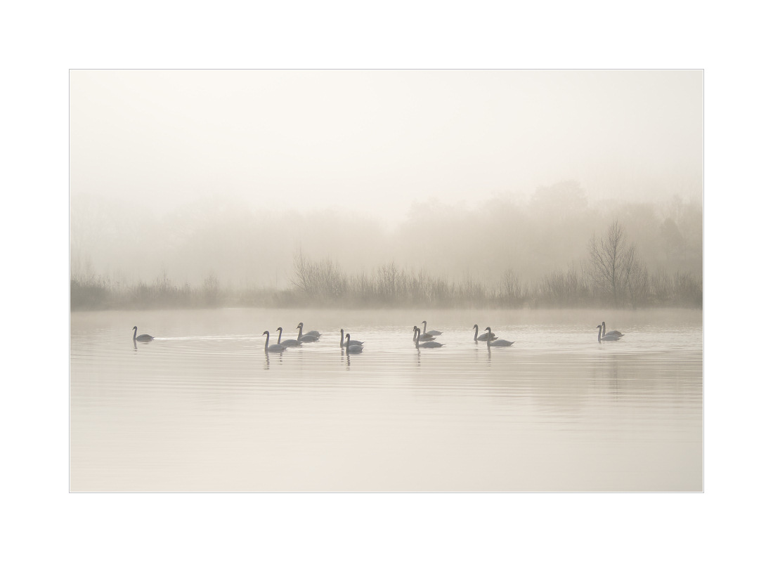 Noch ein Fotonachtrag zum gestrigen Ausflug zu den Baggerseen. Dort hatten die Schwäne logischerweise deutlich weniger Probleme mit dem Hochwasser (wobei es an sich ja nur erhöhtes Mittelwasser war) als die an den Flüssen. Und während es so scheint, als ob die brütenden Schwäne sowohl an der Ohmmündung als auch hier bei mir im Tal ihre Brut verloren hätten, hatte das Paar am Baggersee deutlich mehr Erfolg. Gleich acht quicklebendige Jungschwäne schwimmen dort jetzt durch die Landschaft. Hier ein Familienfoto mit Nebel und den ersten Sonnenstrahlen: