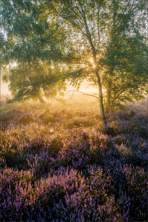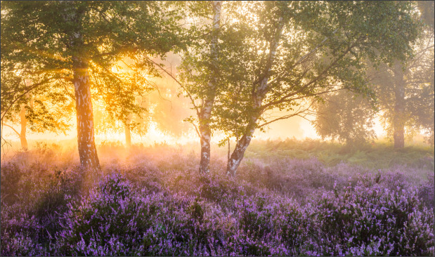 Ein nebliger Morgen in der blühende Heide