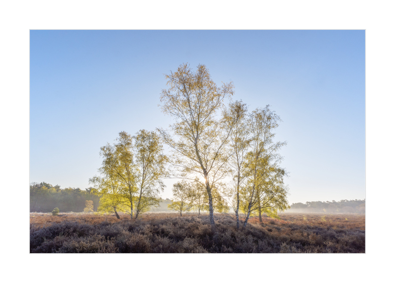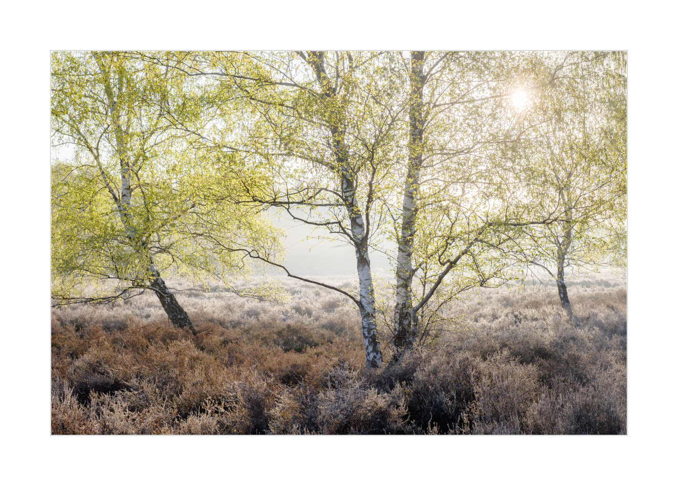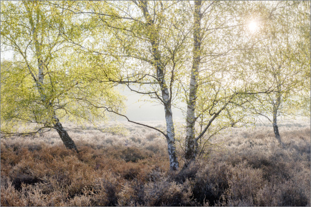 Aber! Neuerung! Endlich mal wieder Fotos nicht freistehender Birken, sondern solche, die per Definition ein Wald sind. Wobei, wenn ich mich richtig entsinne, gibt es viele Definitionen was ein Wald ist. Egal. Birkenwald war es eindeutig in dem Fall. Erst mit eher tief stehender Sonne und dadurch schön warmen Licht. Danach dann mit schon etwas höher stehender Sonne. Das war allerdings in Kombination mit der sehr feuchten Luft nicht weniger reizvoll: