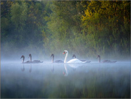 Naja, ein Stück Wiese mit ein paar Bäumen hat heute Morgen dann den Landschaftsteil übernommen. Der Nebel hat immerhin dafür gesorgt, dass Strommasten nicht zu erkennen sind. Und dann waren da noch die Schwäne: Abgesehen von den beiden Familien mit Jungen sind inzwischen auch wieder ein paar andere angekommen. Langsam wird doch spürbar, dass sich der Herbst nähert. Hier ein paar Fotos von heute Morgen: