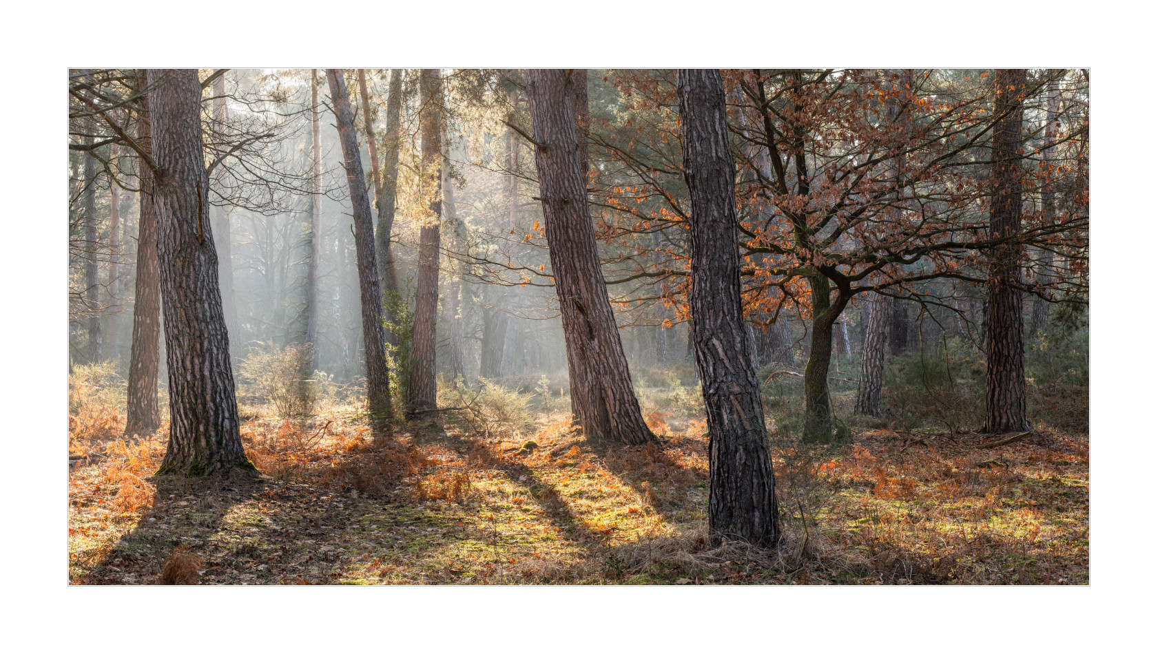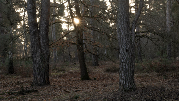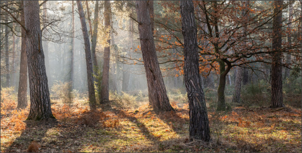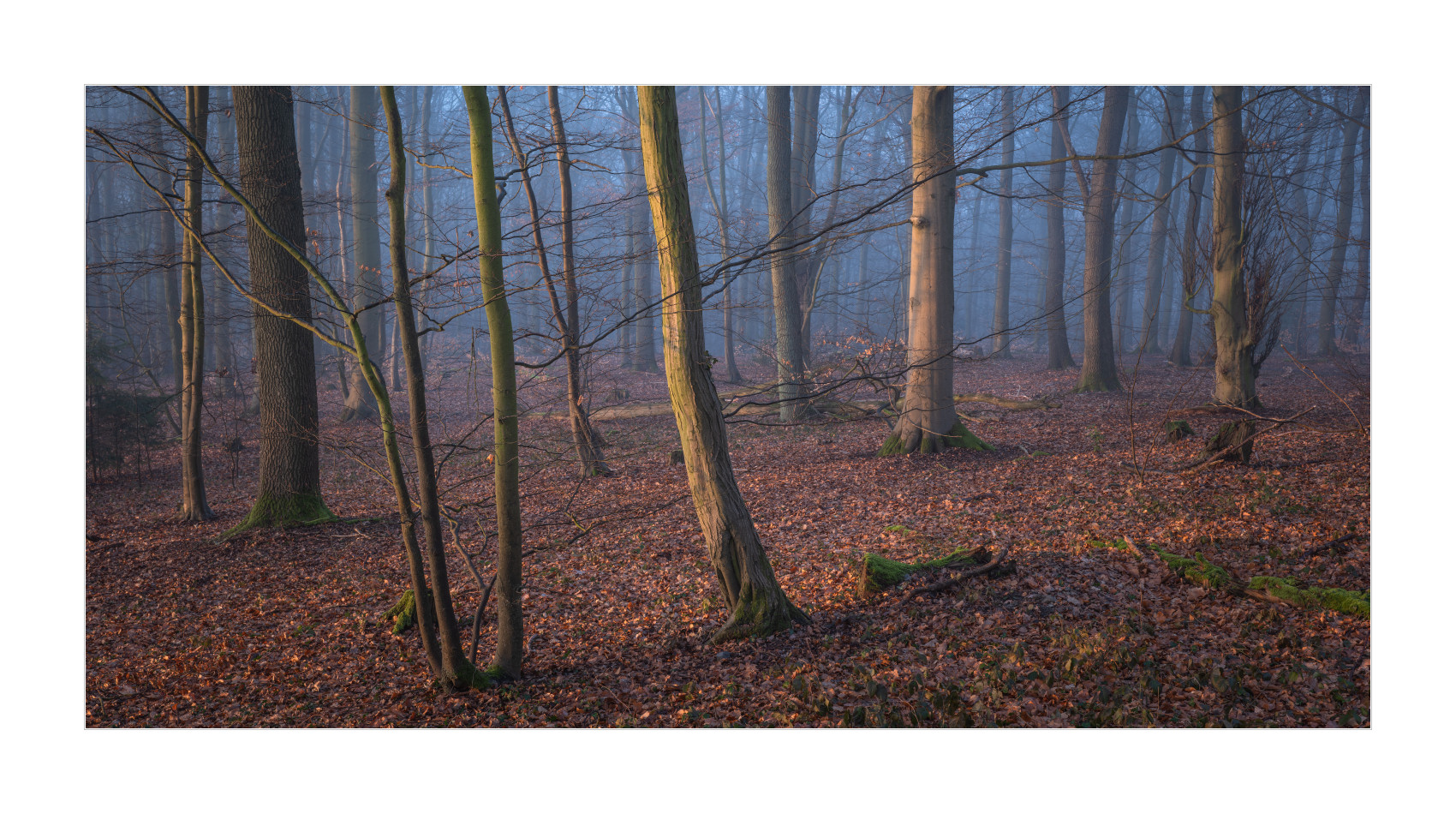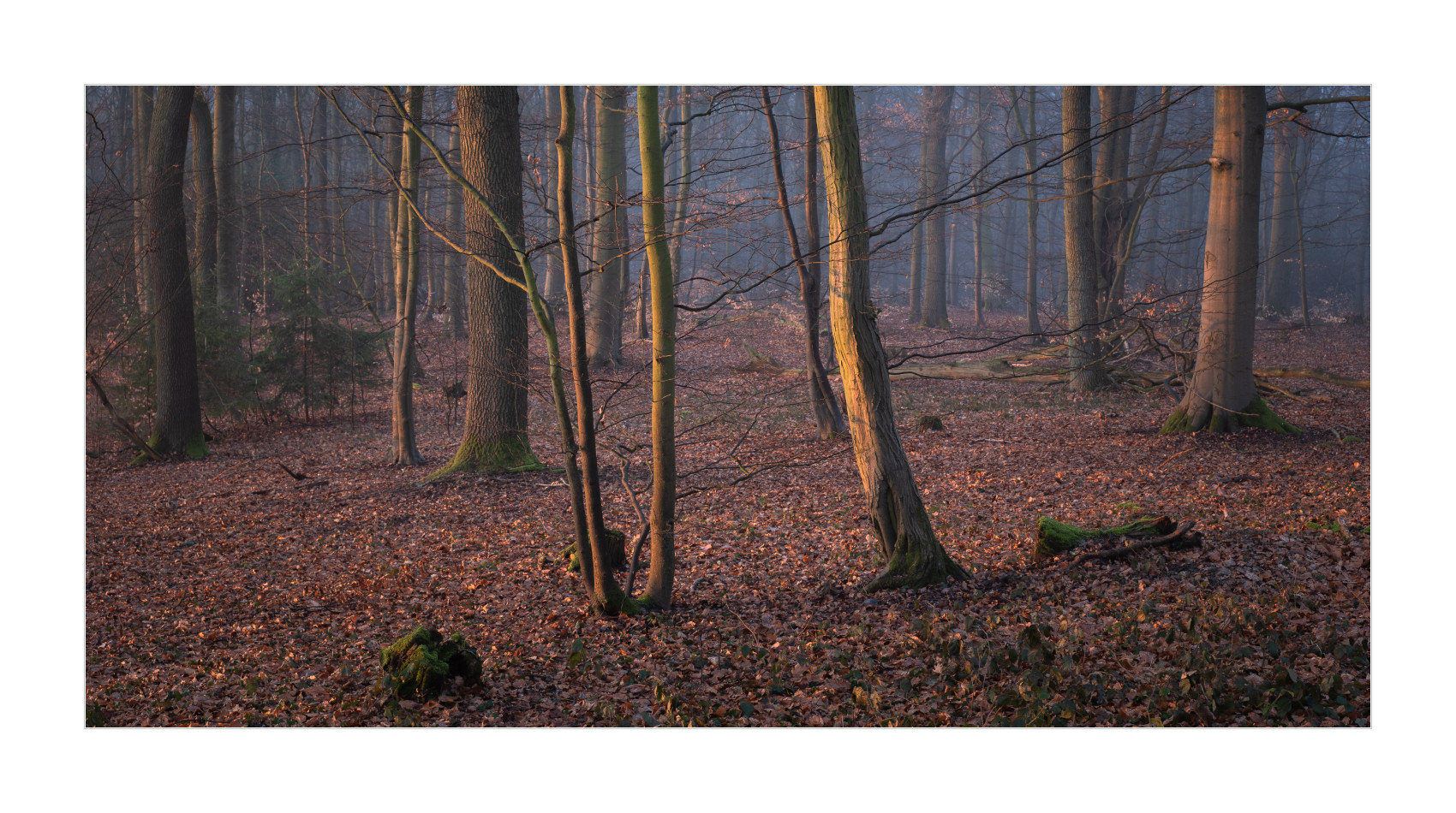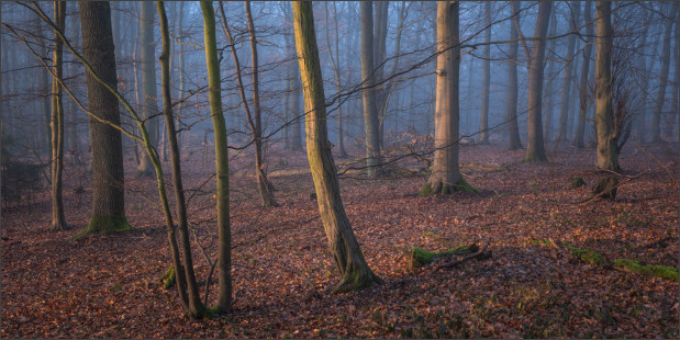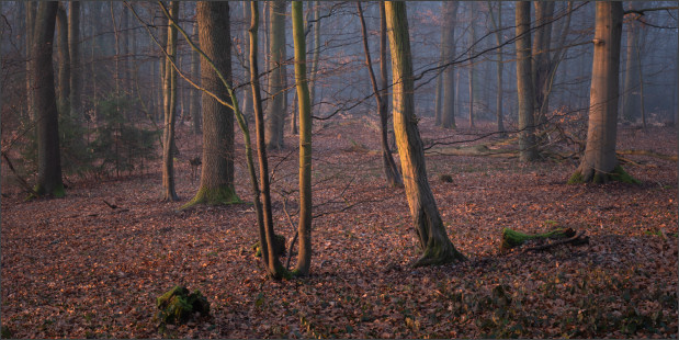 Aber dann wurde es doch noch so richtig edel! Nebel im Wald bei Sonnenaufgang. Geniales Licht einfach. Schrie geradezu nach Panoramaformat. Ich mag es irgendwie, wie die schattigen Bereiche noch schön bläulich erscheinen und die durch die tiefe Sonne beschienenen Teile schön warm. Genau nach meinem Geschmack: