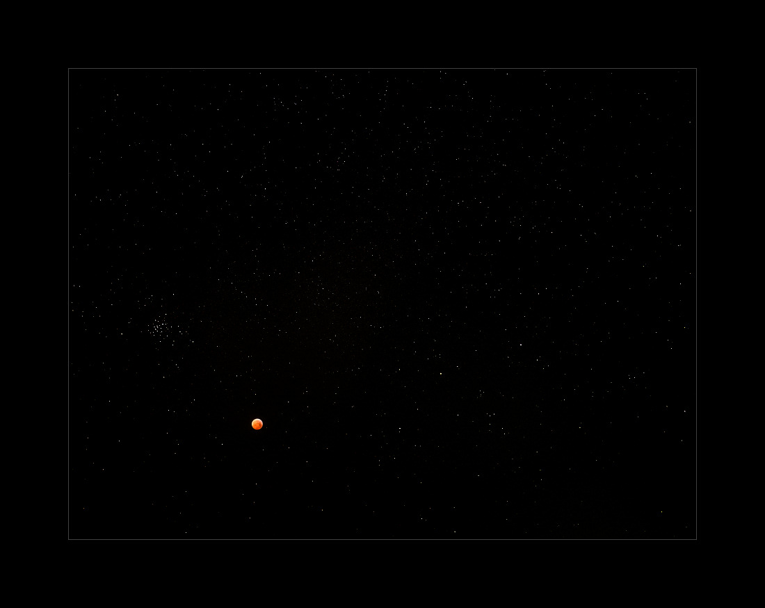 Jedenfalls, kalt war es heute Morgen. Das Thermometer hat -11°C angezeigt. Dunkel war’s, der Mond schien nicht helle. Mondfinsternis eben. Zu den tausenden Fotos, die vermutlich heute Morgen entstanden sind, habe ich dann auch noch was beizutragen. Kleiner Mond mit ein paar Sternen: